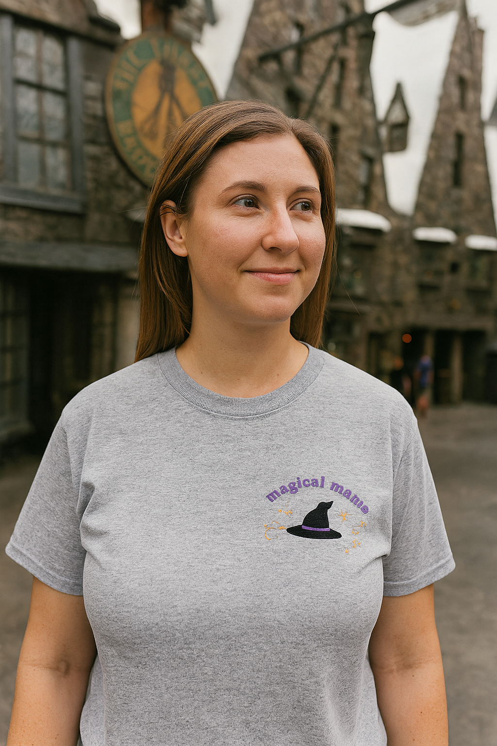 Bring a little everyday magic to your wardrobe with our Magical Mama tee. Whether you’re stirring up bedtime stories, crafting kitchen spells, or sharing warm cuddles, this shirt is your go-to for comfort and charm. Featuring an embroidered witch hat with a playful purple band, it’s a subtle nod to the magic that only moms can make.